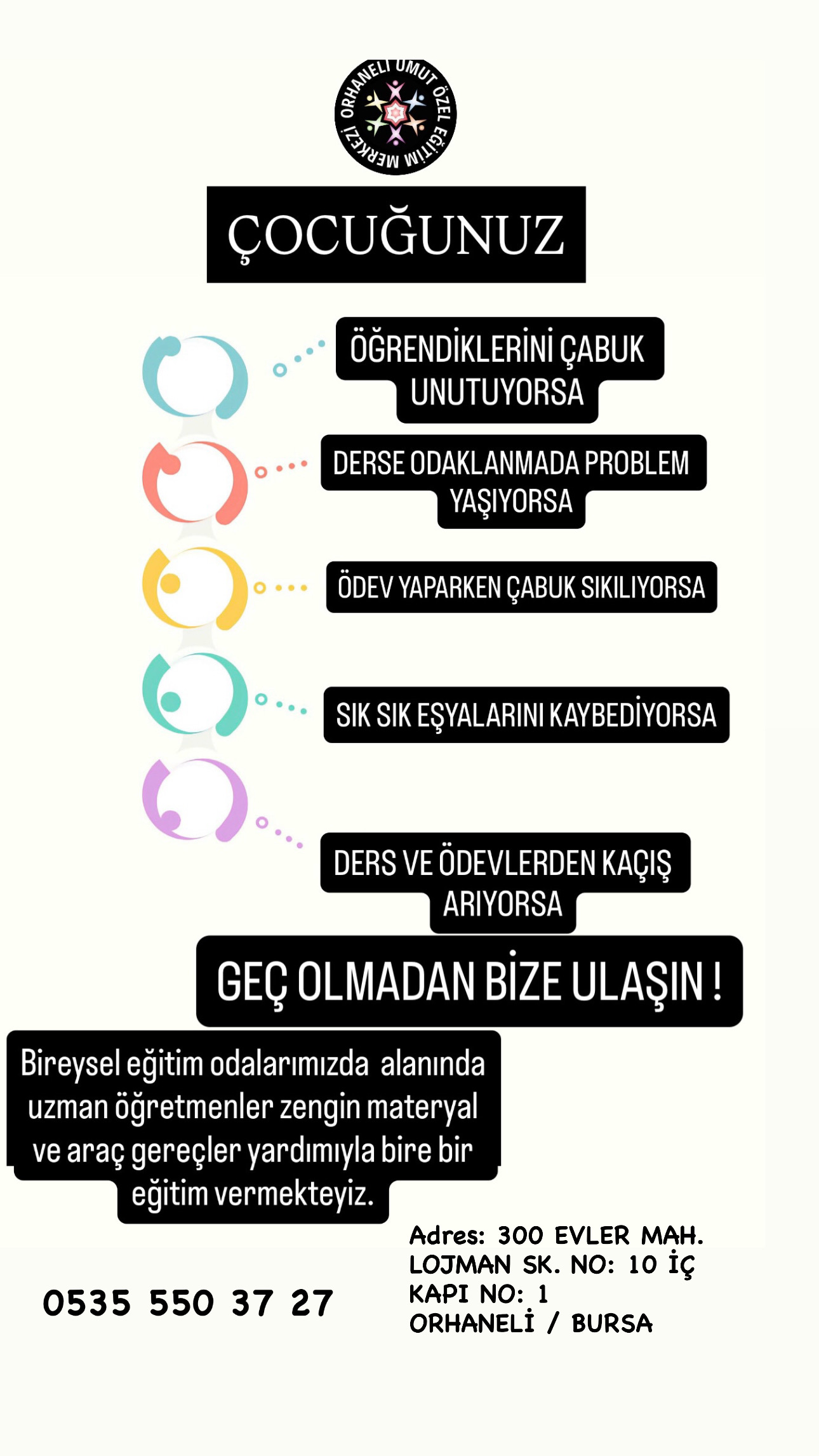 Umut Özel Eğitim ve Rehabilitasyon Merkezi 2009 yılında Orhaneli’de açılan ilk özel eğitim ve rehabilitasyon merkezi olup Orhaneli, Büyükorhan Harmancık ilçelerinde ihtiyacı olan bireylere hizmet vermeye devam etmekte, alanında deneyimli ve uzman kadrosuyla eğitim hayatını sürdürmektedir. Bursa’nın dağ ilçelerinde özel çocuklara eğitim veren tek kurumdur.